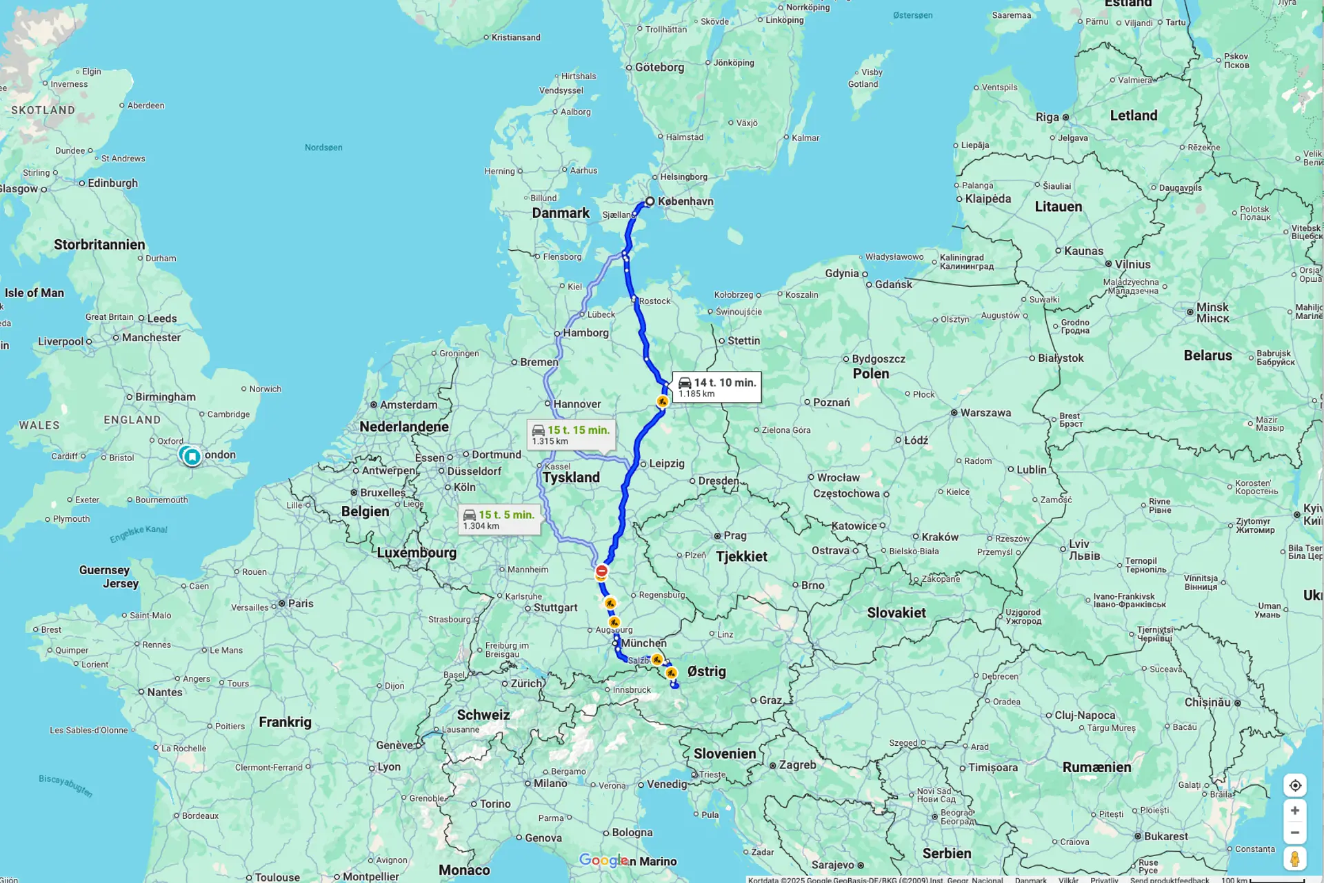 Alternativt kan du vælge at tage færgen fra Rødby. Fra København kører du sydpå ad E47 til Rødbyhavn, hvor du tager færgen til Puttgarden i Tyskland. Overfarten er en god mulighed for at tage en pause fra kørslen. Når du ankommer til Puttgarden, fortsætter du ad A1-motorvejen mod Lübeck. Herfra følger du samme rute som via Storebælt, hvor du bevæger dig mod Hannover og derefter videre ad A7 mod Østrig.